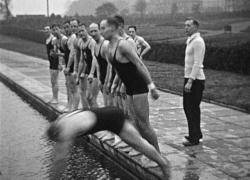 Among the procession there are some scouts and a man dressed as a flamenco dancer who poses for the camera with two girls in bathing costumes, followed by children in fancy dress. Men dressed as cowboys ride horses down the street before the mayor and other local dignitaries in an open-top car. Other fancy dress costumes are shown including a clown, a man in a cage trying to escape and a hot-air balloon. A comedy routine is performed using a pair of boxing gloves and a cricket bat, before the May Queen and her entourage of page boys and maids go past.