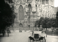 Then a banner appears on a road for ‘Hall Sunday School’, followed by a marching brass band, children and parents, at Whitsuntide. Cattle, belonging to Harold Ellis, run across a field, high above a large factory, as the band passes. A large crowd of people have gathered in a street as the parade marches by. The film switches to show some children near a house where building work is being carried out, and then the filming is from a moving vehicle before showing a cross country race. A man and a boy go to an event with a motorcycle display team, and sheep dog trials at Harden Moss, near Holmfirth (started by Colin’s father, Alfred Tinker, and Haig Howard in 1910).