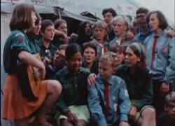 Using scarves, girls of all ages dressed in different coloured costumes perform a group dance in the arena. Inside the bandstand, three girls perform a dance with tambourines. A man wearing pyjamas and a woman in a pink hat walk around the side of the river and along the jetty. A jazz band plays on the riverbank next to the marquee. Audiences gather at the side of the river to watch a series of games and events which take place on the water. Children row in a little dingy past balloons on the water, while men throw rubber rings over each other’s heads and have water fights.